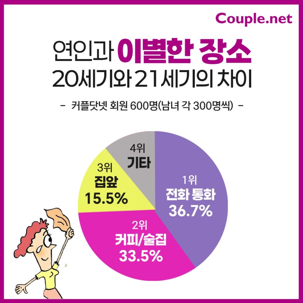 글로벌 매칭 플랫폼 커플닷넷은 사이트에 가입한 회원들 중에 연인과 헤어진 경험이 있는 남녀 각 300명, 총 600명에게 이별한 장소를 설문조사했다. 커플닷넷은 1995년에도 동일한 조사를 진행한 적이 있어서 두 조사 결과를 바탕으로 20세기와 21세기에 연인과 헤어지는 장소를 비교했다.