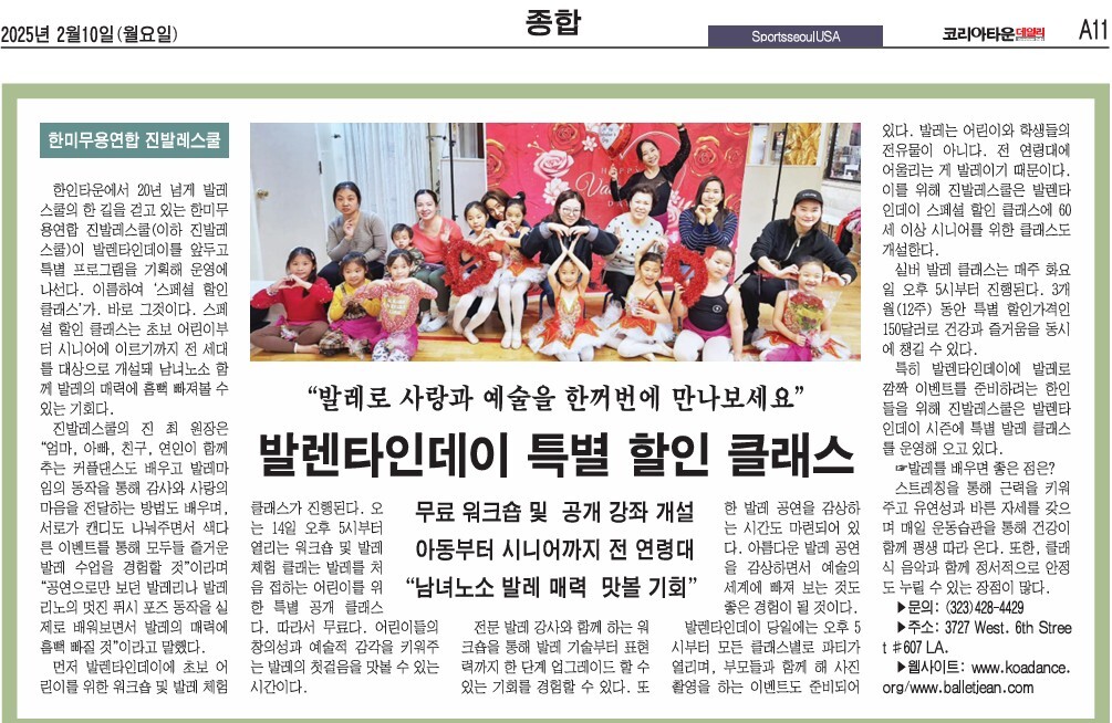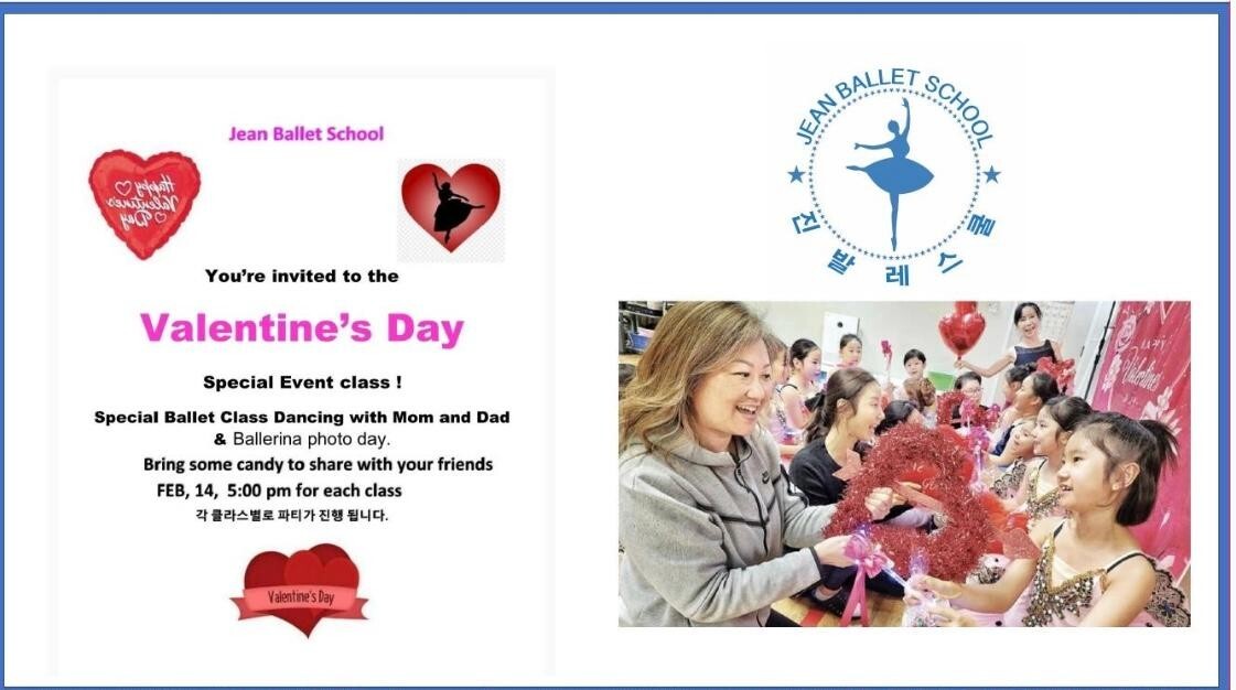 연인, 친구, 가족과 함께하는 로맨틱한 커플발레 수업, 동작으로 감정을 표현하며 사랑을 전하는 법을 배울 수 있는 발레 마임 수업, 발레를 처음 접하는 어린이들을 위한 특별 무료 발레 체험 오픈클래스 (2월 14일 금요일 오후 5시), 60세 이상의 어르신들을 위한 실버 발레 (매주 화요일 오후 5시, 특별 3개월 과정 $150)등 밸런타인 특집 클래스에서는 다양한 연령대가 발레와 사랑을 만날 수 있도록 밸런타인데이 특별 프로그램이 준비되어 있다.