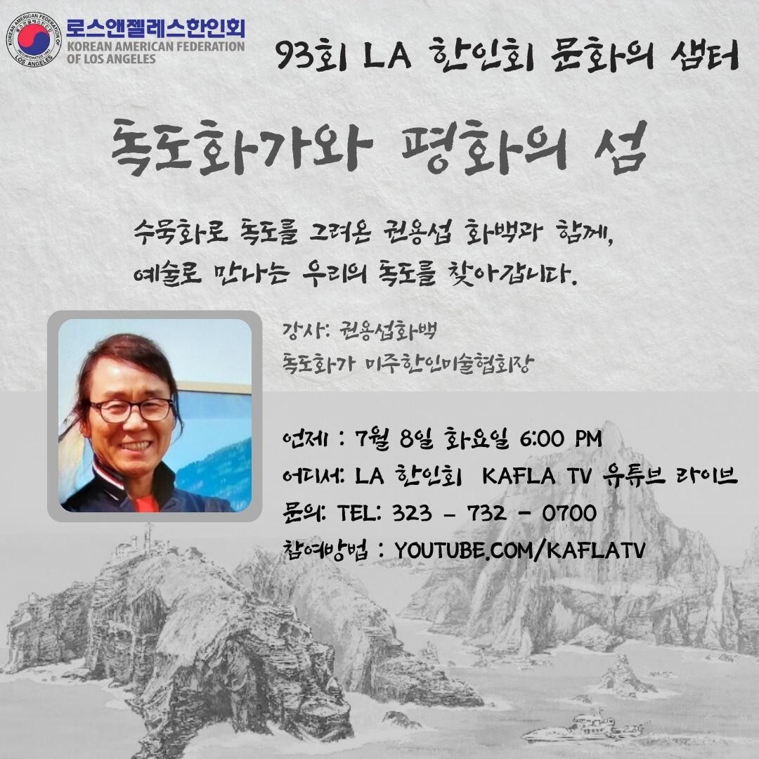 LA 한인회(회장 로버트 안)는 오는 7월 8일(화) 오후 6시에 제93회‘문화의 샘터’ 온라인 강좌인“독도화가와 평화의 섬”을 개최합니다. 이번 강연에는 세계를 무대로 수묵화 예술과 평화 메시지를 전해온 권용섭 화백을 초청하여, 한국의 영토인 독도와 격렬비열도에 대한 예술적 접근을 통해 그 소중한 가치를 나누는 시간을 마련할 예정입니다.