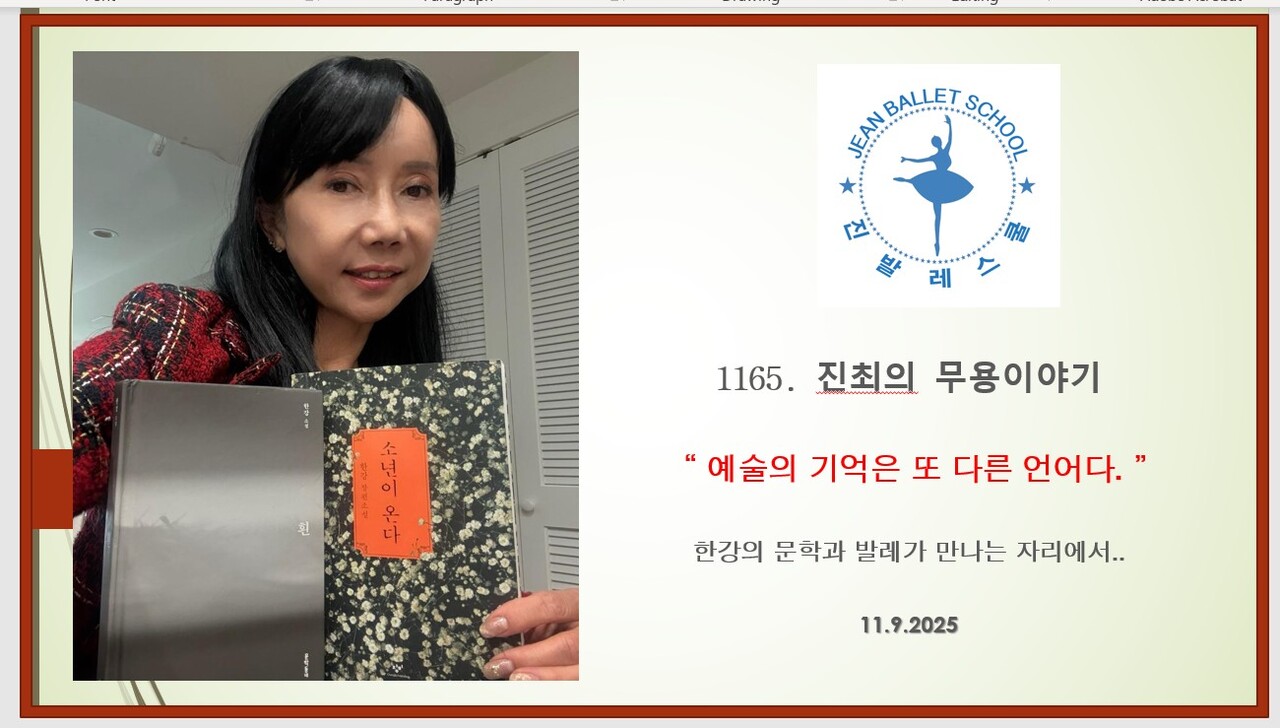 한강의 “소년이 온다” 를 읽으며 그 감정은 다시 되살아났다. “죽은 자들이 산 자들을 어떻게 도울 수 있는가.” 그 문장은 내 발레 인생의 주제와 닮아 있었다. 한강 작가는 동호라는 어린 중학생 인물을 통해 광주 항쟁의 비극을 담담히 그려내며, 우리가 잊고 싶어 했던 고통을 다시 마주하게 한다. 그는 세상을 떠난 이들의 목소리를 빌려, 우리가 어떤 삶의 진실을 잊지 말아야 하는지를 묻는다.