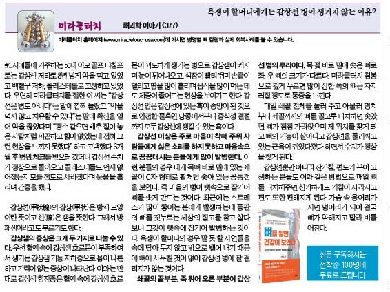 갑상선뿐만 아니라 잔기침, 편도가 부어 고생하는 분들도 이와 같은 방법으로 매일 뼈를 터치해주면 신기하게도 기침이 사라지고 편도 또한 편해지게 된다. 가슴 속 응어리가 지면 덩어리가 되어 결국 뼈가 약해지고 말라 비틀어진다.