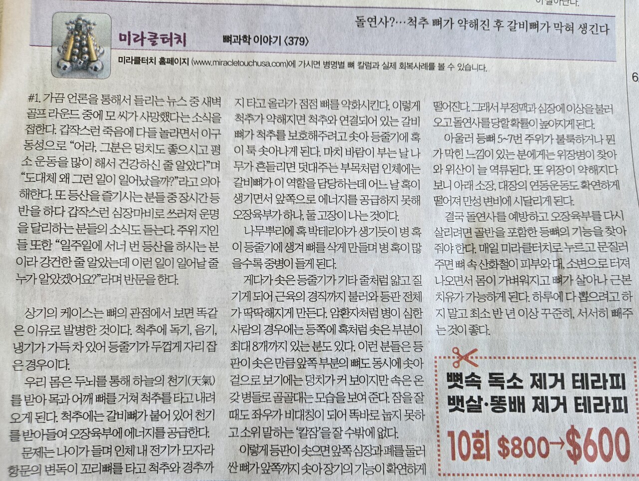 ▶문의:LA(213)675-6877, OC(213)255-1410 미라클터치 뼈과학 연구소