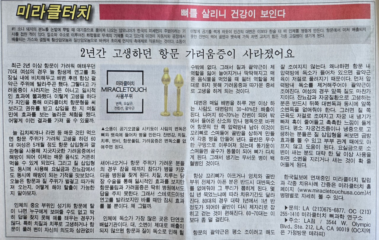 ▶문의:LA(213)675-6877, OC(213)255-1410 미라클터치 뼈과학 연구소